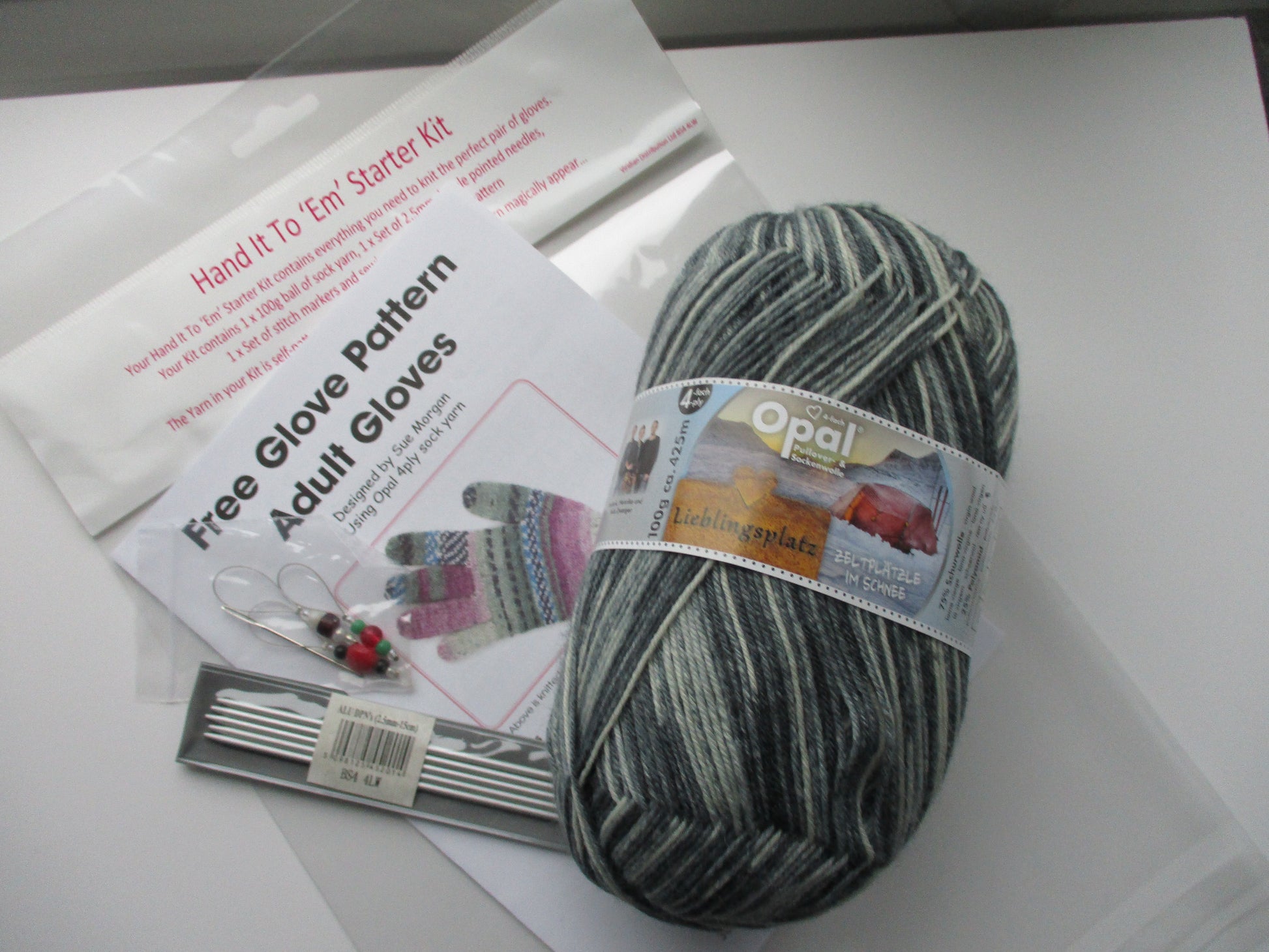 Hand It To 'Em knitting kit. Kit contains one ball of Opal Sock Yarn , One set of 2.5mm double pointed needles, a set of stitch markers, sewing needle and a simple glove pattern . The yarn is self-patterning, just knit away and watch the pattern magically appear.