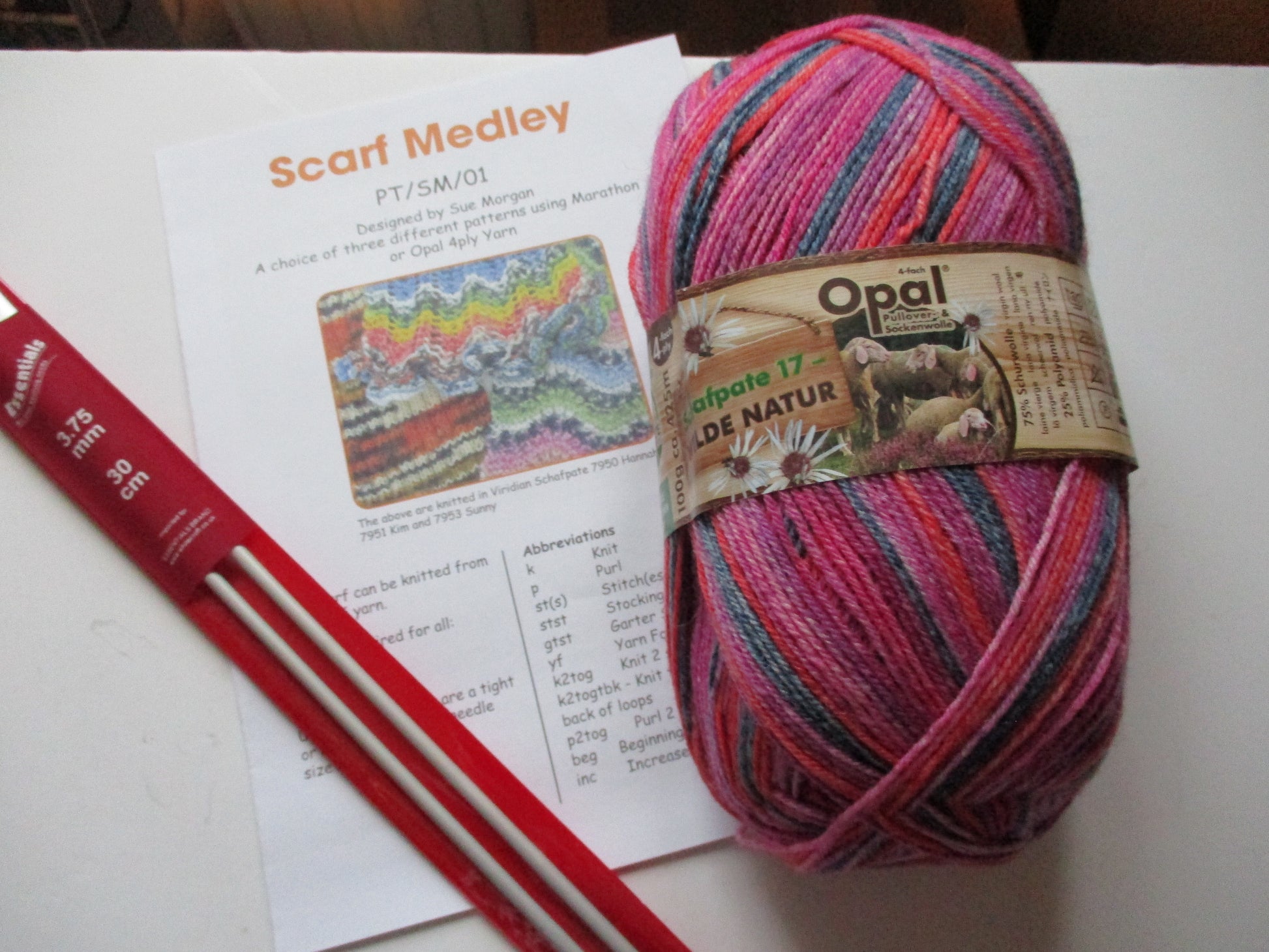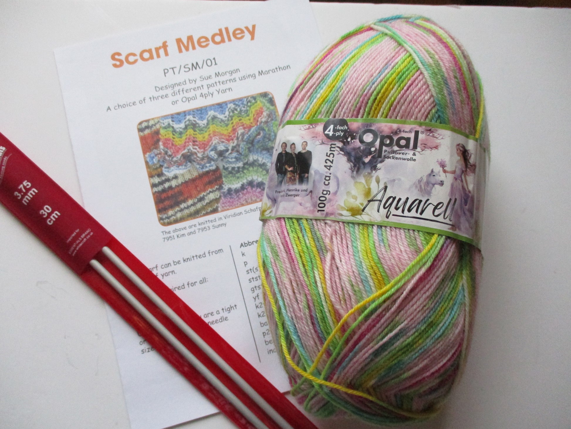 Scarf Knitting Kit. A great kit to make your own super cosy scarf. Three designs in one pattern to choose from - Rib pattern, Wavy pattern or Frilly pattern. Kit contains one 100g ball of Opal Sock Yarn, a pattern by Sue Morgan, a pair of each 3.75mm needles. Great to give as a gift to a knitter or a treat for yourself. The yarn is self-patterning, just knit away and watch the pattern magically appear.