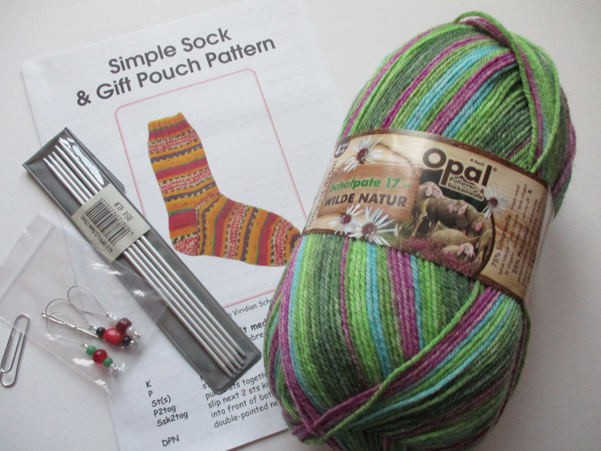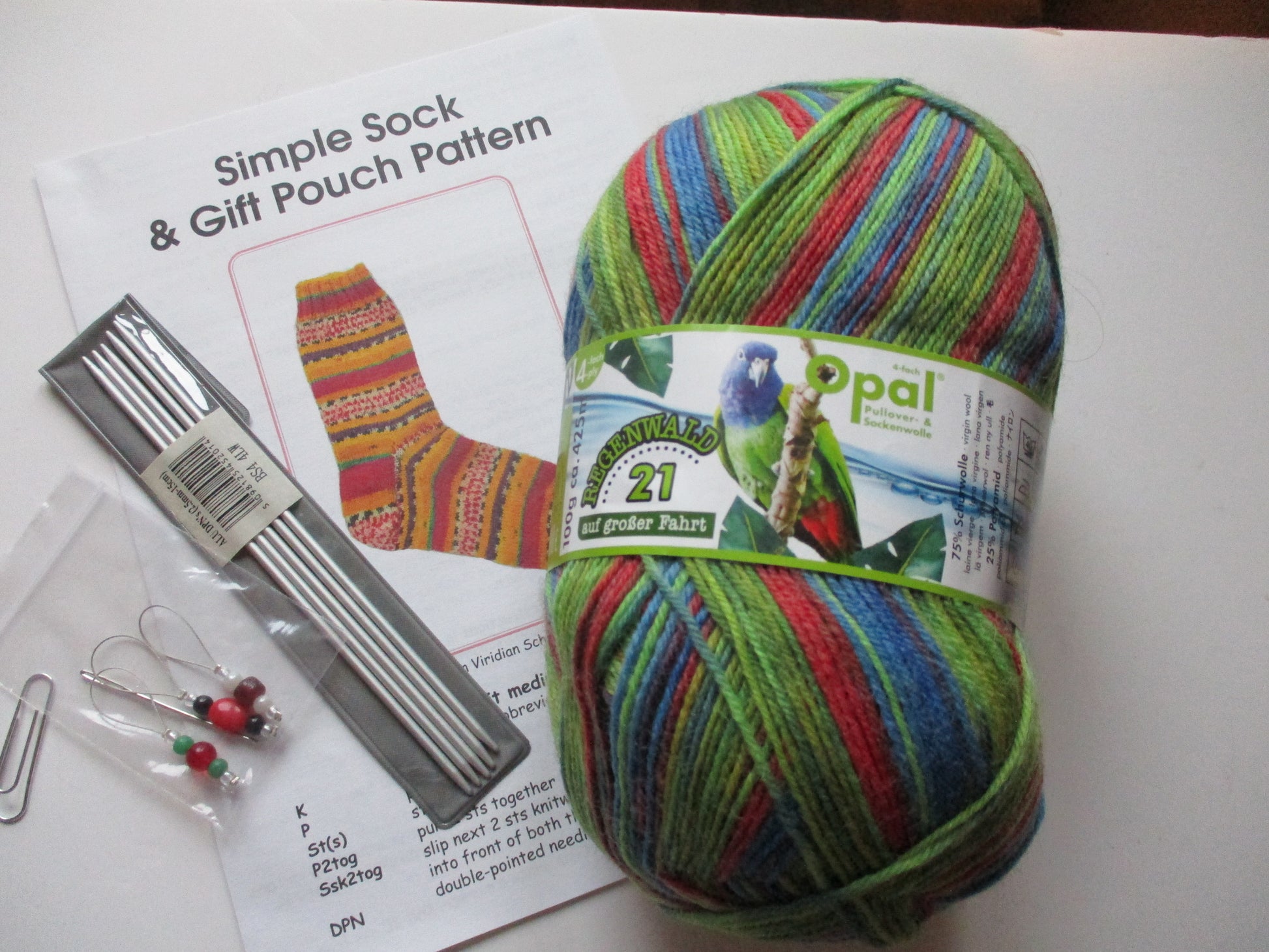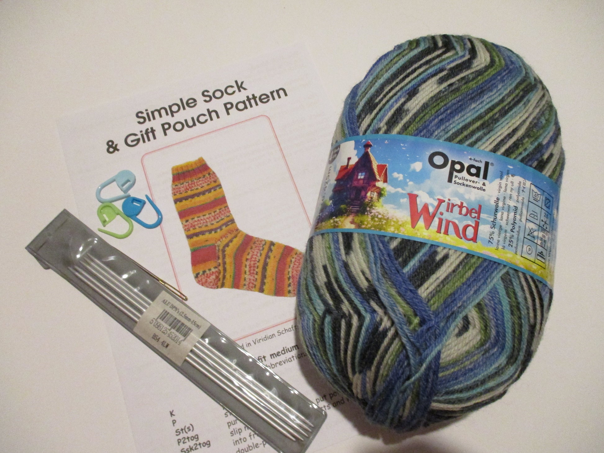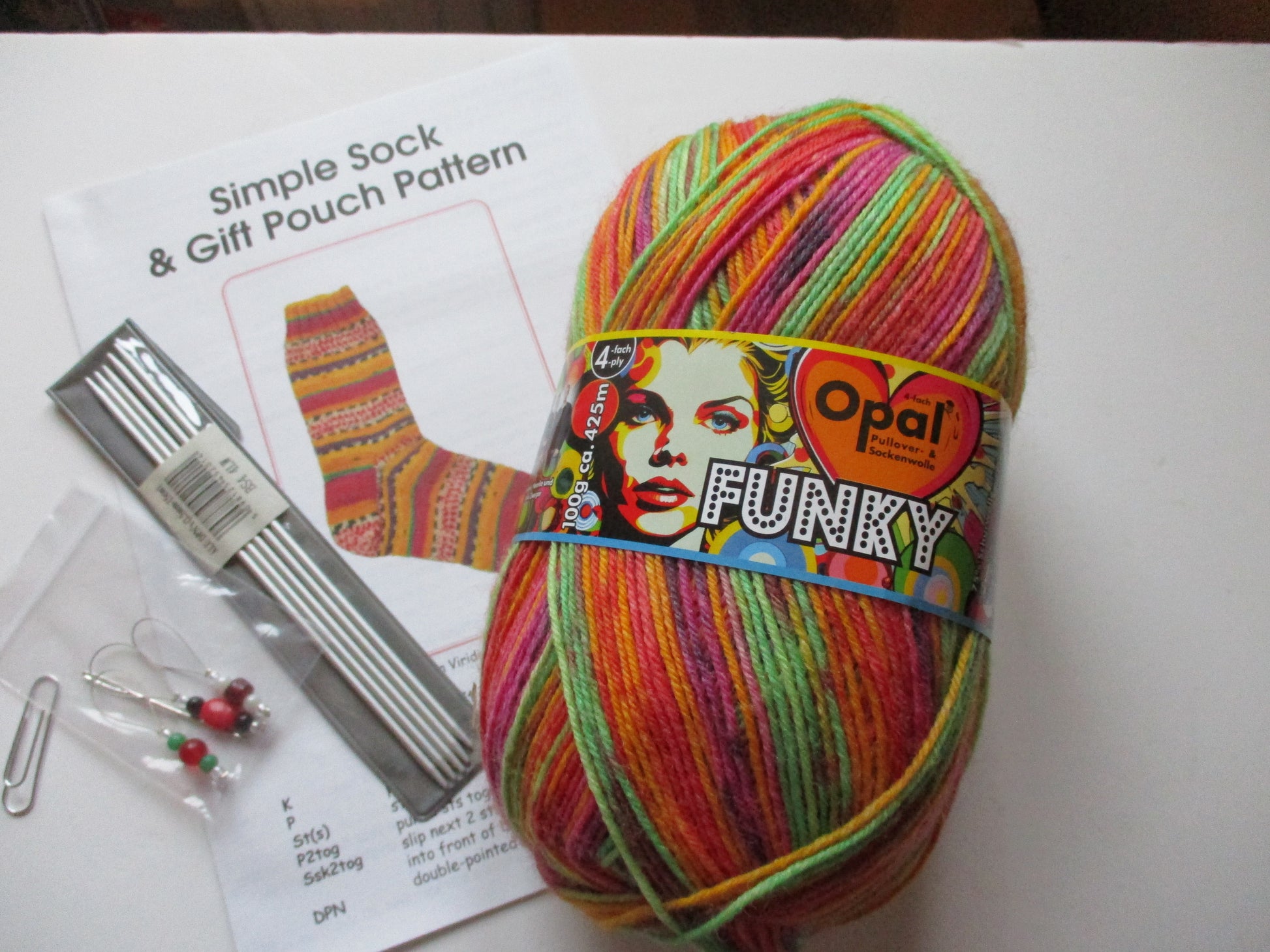Sock It To 'Em knitting kit. Kit contains one ball of Opal Sock Yarn . One set of 2.5mm double pointed needles, a set of stitch markers, sewing needle and a simple sock pattern / gift pouch pattern. The yarn is self-patterning, just knit away and watch the pattern magically appear.